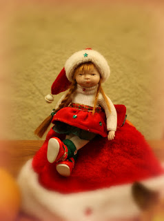 Et bien voila, j'avais dessiné le croquis d'une poupette, pour un concours ! La gagnante voyait sa poupée réalisée et mon croquis n'avait pas été sélectionné ! Alors je l'ai faite moi même ! Et en plus j'ai été boostée à la finir (elle était commencée depuis cet été) par le nouveau défi de "la Malle aux poupée", faire une petite mère Noël ! Une frimousse trouvée dans une boutique aux USA, deux adorables petites mains.... après, j'ai galérer pour créer un patron dont les proportions collent avec la petite tête ! Voila le résultat, une poupette de Noël !